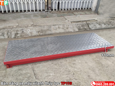 Bàn nâng xe máy âm nền xilanh thủy lực TP110, mặt bàn được phủ toàn bộ bằng inox, xilanh nâng khỏe với hệ thống chốt an toàn, hãm chậm khi hạ bàn.